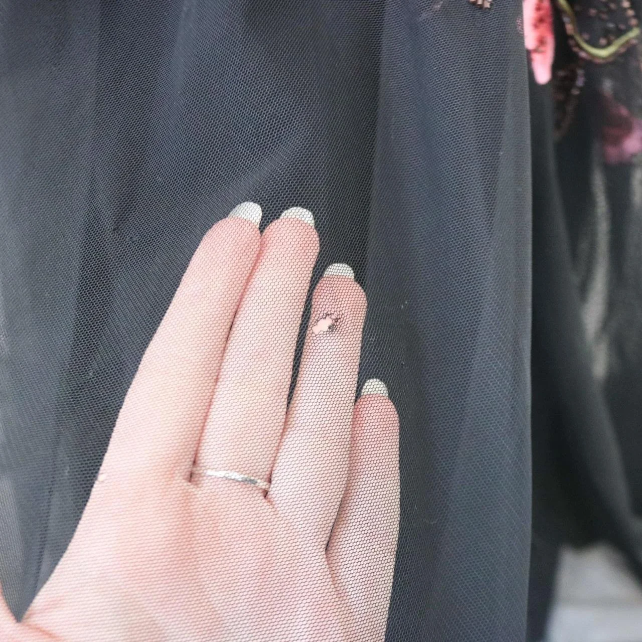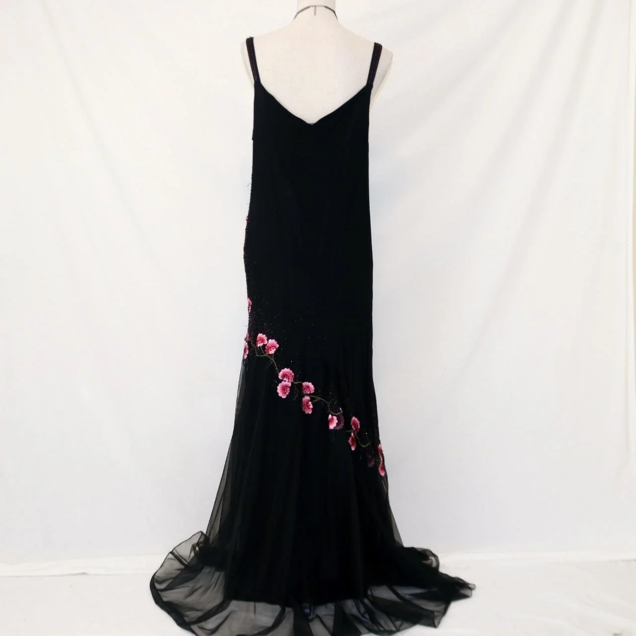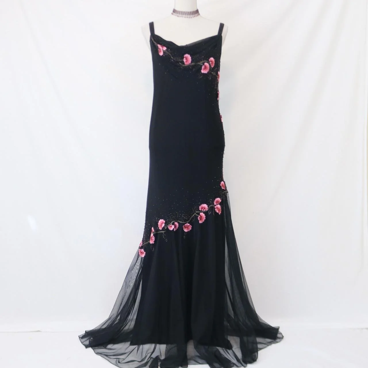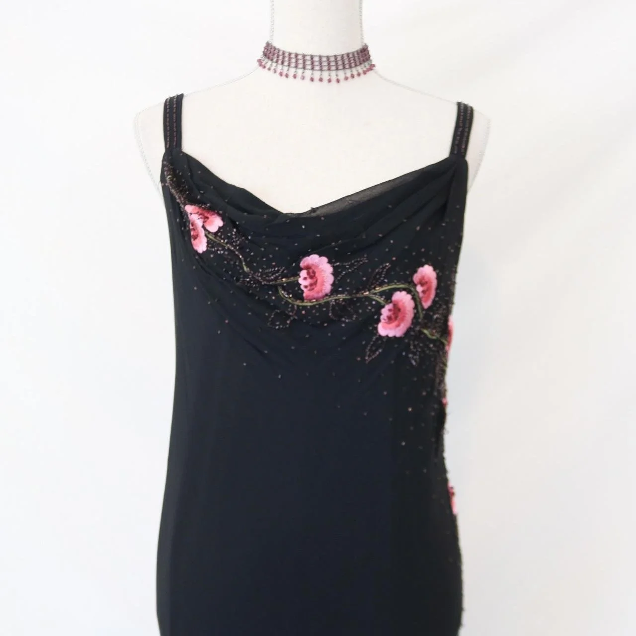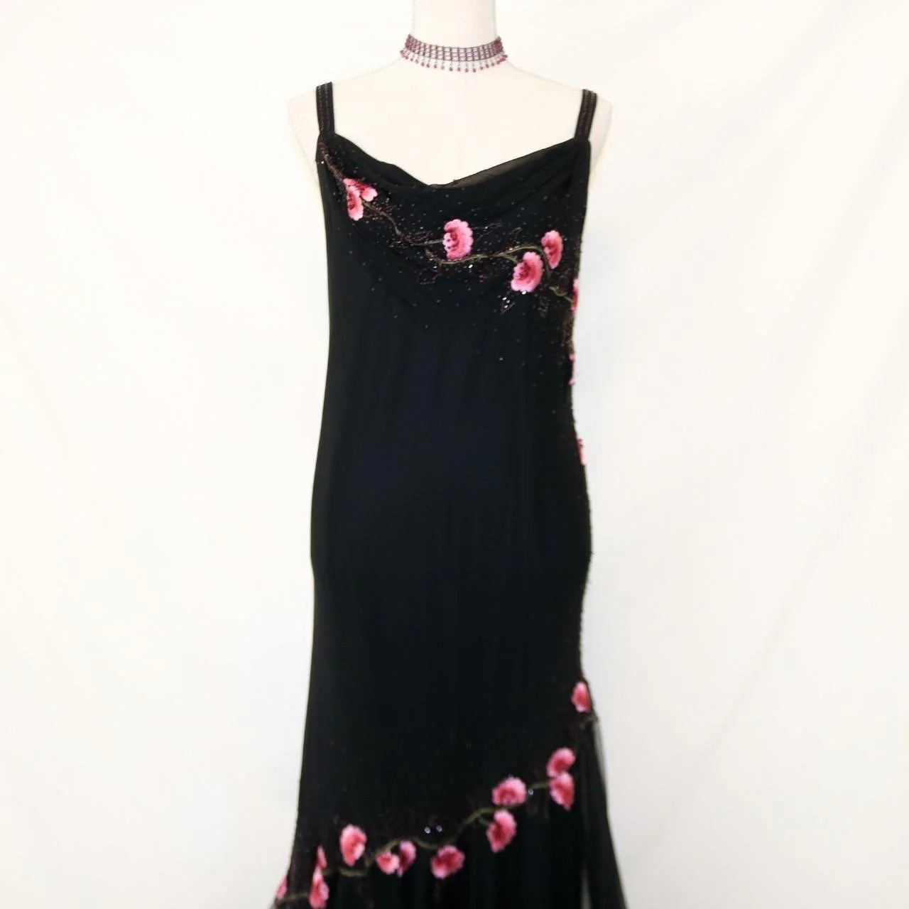 Timeless vintage black 100% silk fitted gown with, pink beaded floral detailing, perfect for prom!