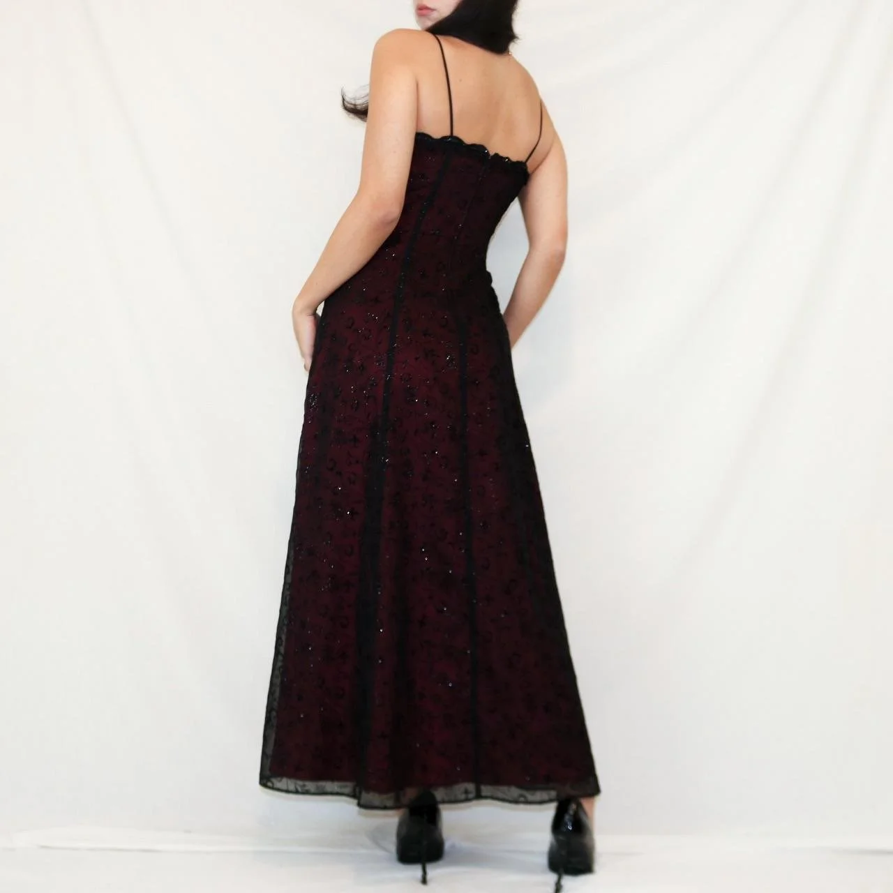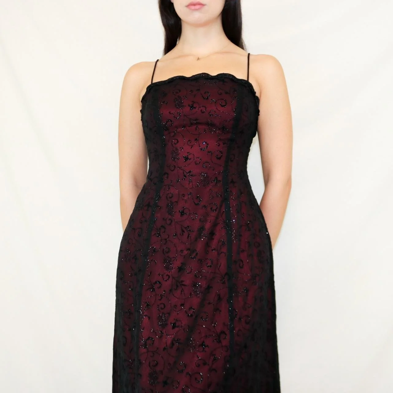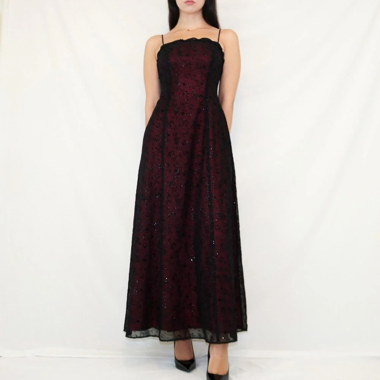 Breathtaking vintage red dress with black floral mesh overlay, perfect for prom!