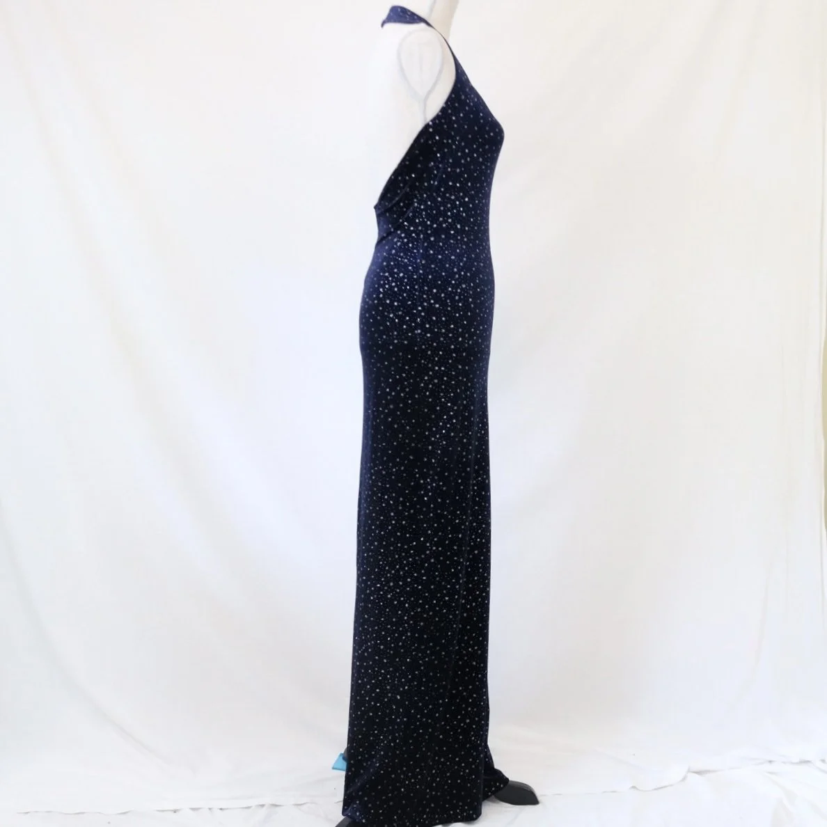 Beautiful navy blue velvet fitted gown with glitter that looks like stars, halter neck, perfect for prom!